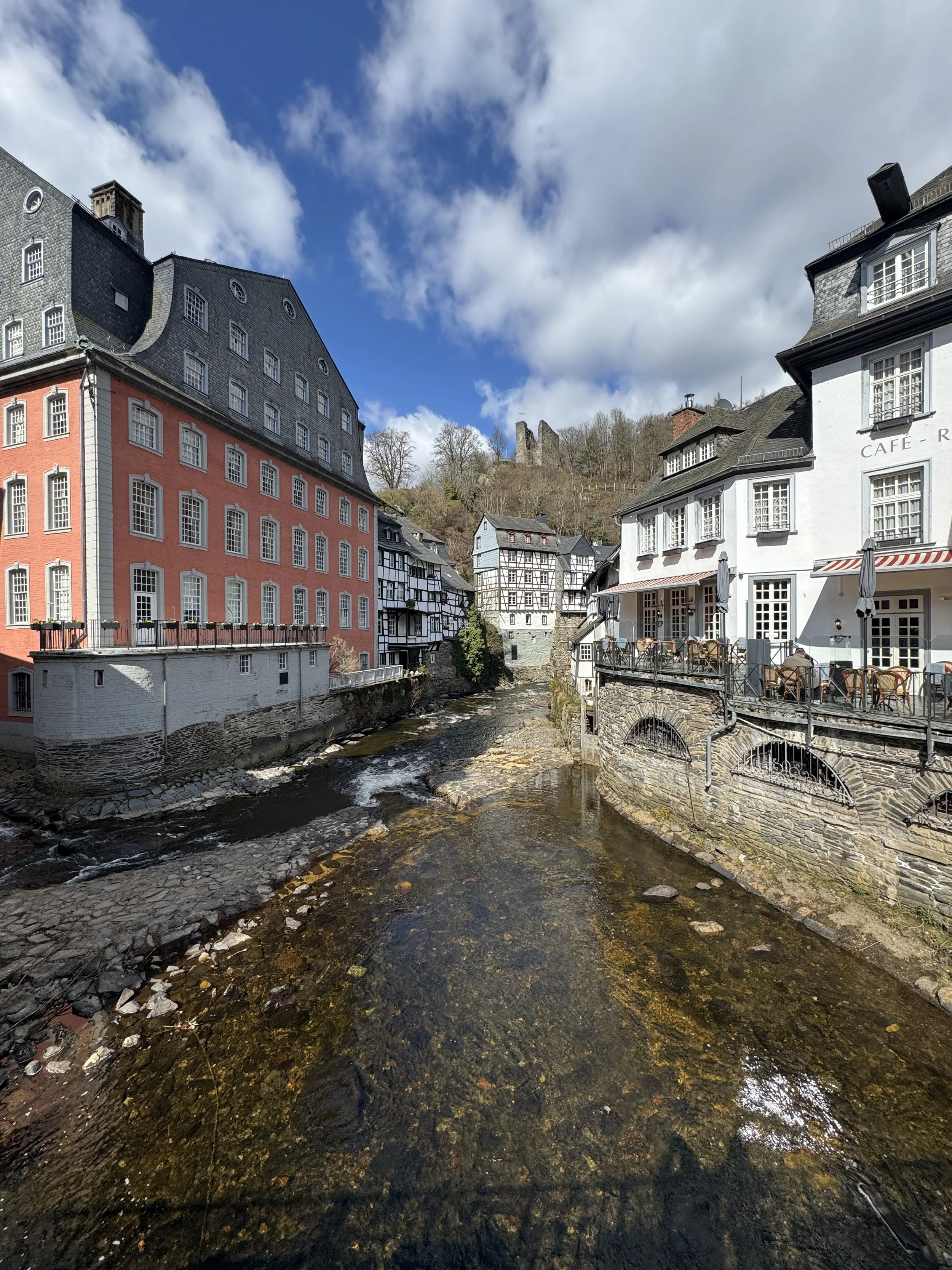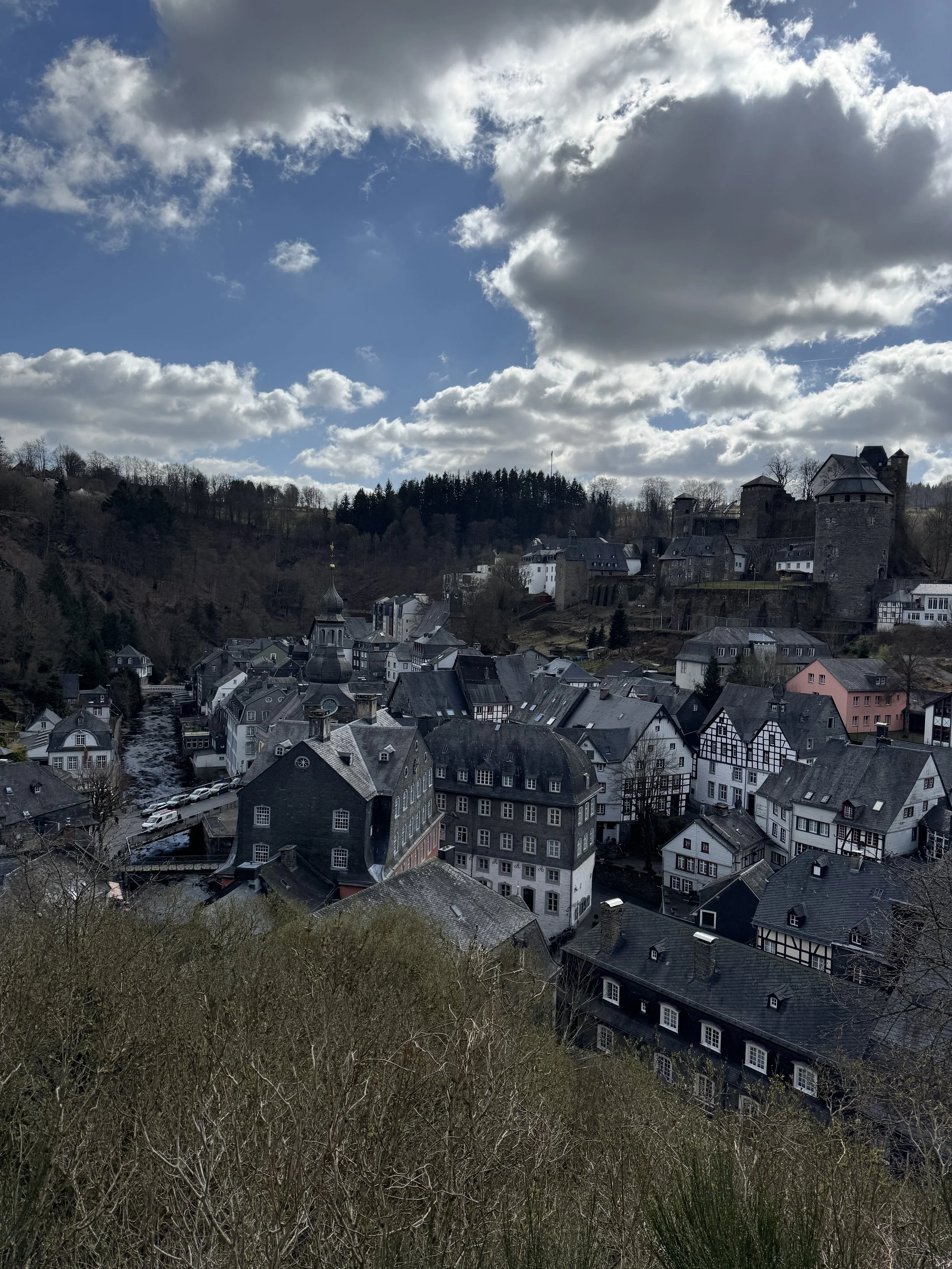 Aamulla suuntasimme kohti Monschaun kylää, joka on tunnettu satumaisesta vanhastakaupungistaan, kapeista kujistaan ja vuoristopuroistaan. Monschau sijaitsee lähellä Belgian rajaa ja on kuuluisa myös sinapistaan (Monschauer Senf) sekä jouluperinteistään.