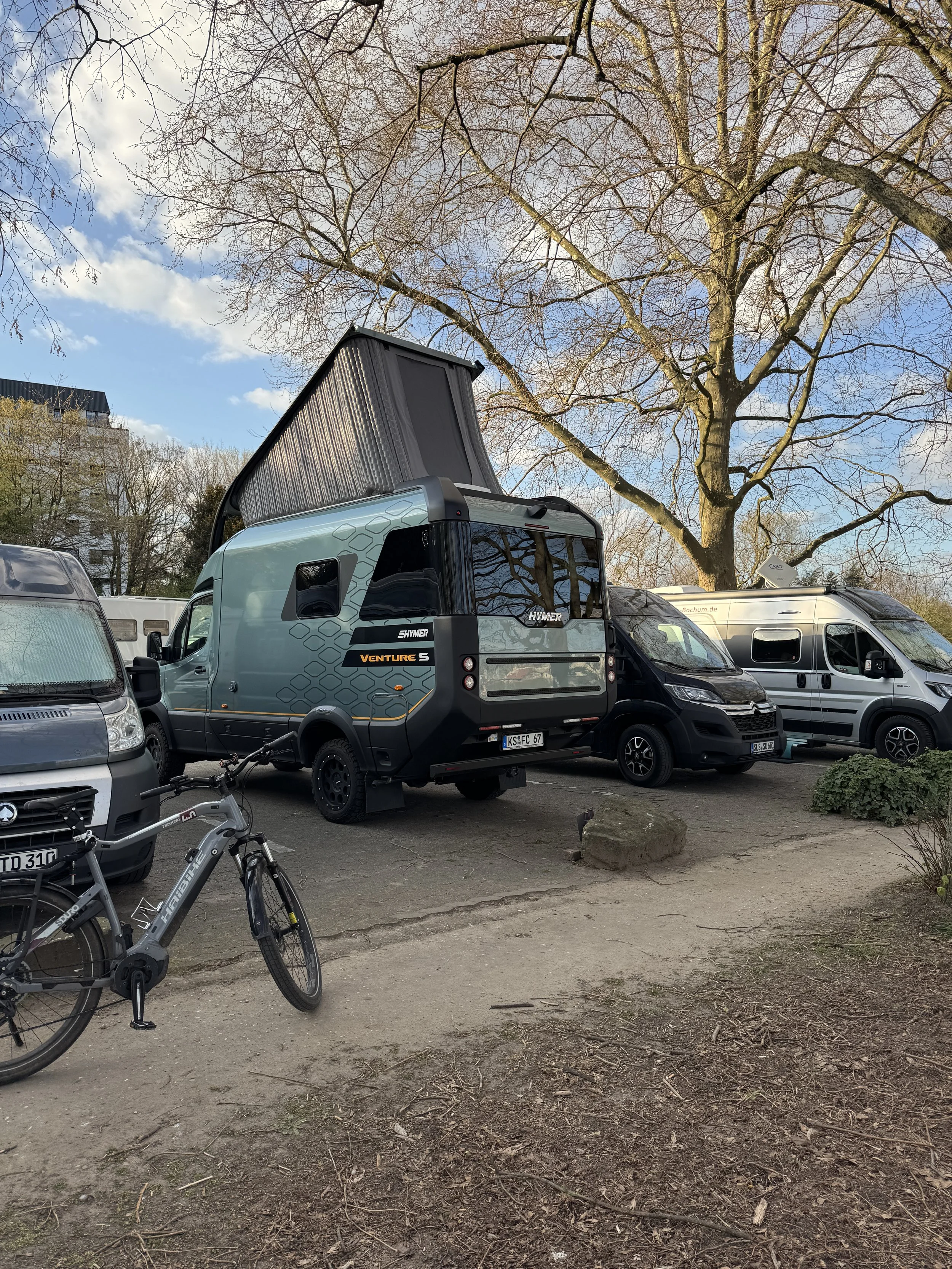 Paikka oli siisti ja turvallinen, joten jätimme auton huoletta parkkiin ja lähdimme kävellen kohti keskustaa. Parkkipaikalla näin myös unelmieni matkailuauton – Hymer Venture S mallin – ensimmäistä kertaa livenä. Se herätti ohikulkijoiden ihastusta ja omaa unelmaani Vanstoorin tulevaisuuden kalustosta.