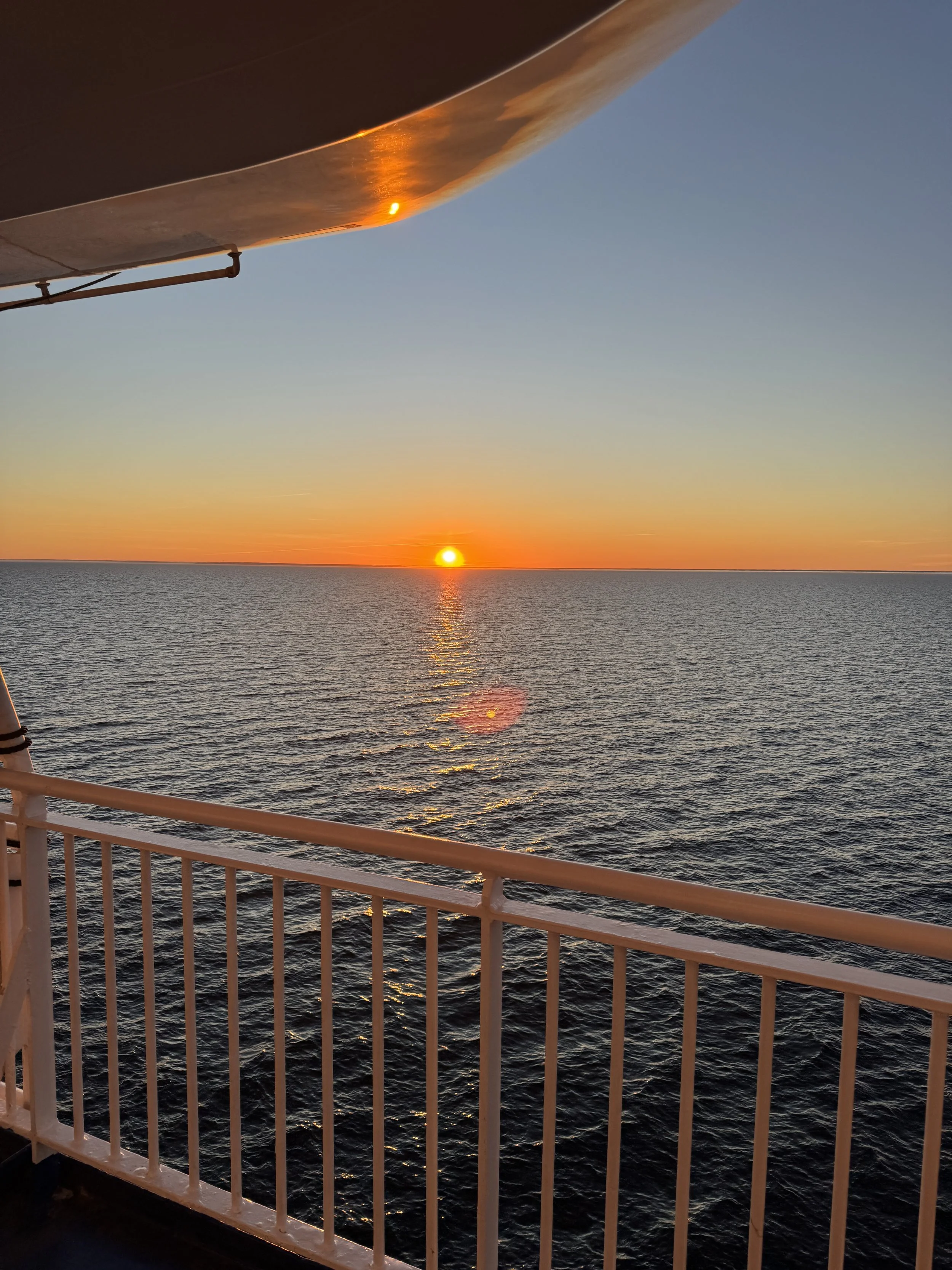 Illalla ajoimme Finnlinesin laivaan Travemündessa. Matka Vuosaareen kestää noin 30 tuntia, sisältäen yhden päivän ja kaksi yötä. Olimme varanneet ateriapaketit etukäteen, joten ruokailut sujuivat helposti laivan buffetissa. Päivä kului nopeasti syöden, leväten ja tietokoneella töitä tehden.