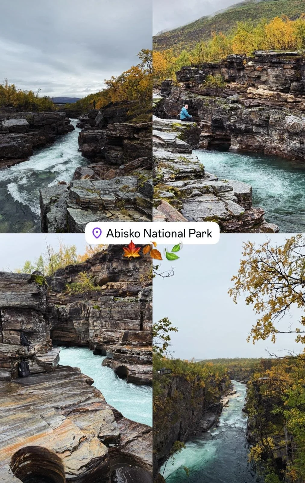 Aamulla heräsimme virkeinä – yö oli sujunut kaikilta jo paremmin. Aamupalan jälkeen jatkoimme kohti Abiskon luonnonsuojelualuetta. Valmistautuminen vaellukseen oli sateen vuoksi hieman hankalaa, mutta pian lähdimme kulkemaan pitkin Abiskon halki virtaavaa suurta koskea. Sen reunustamat kiviseinät olivat valtavia, ja maisema teki vaikutuksen. Alun perin olimme ajatelleet kävellä järvelle, josta koski saa alkunsa, mutta tunnin kävelyn jälkeen kartasta selvisi, että olimme vasta viidenneksen matkasta kulkeneet. Päätimme palata ja jatkaa toista reittiä koskea pitkin kohti rantaa.