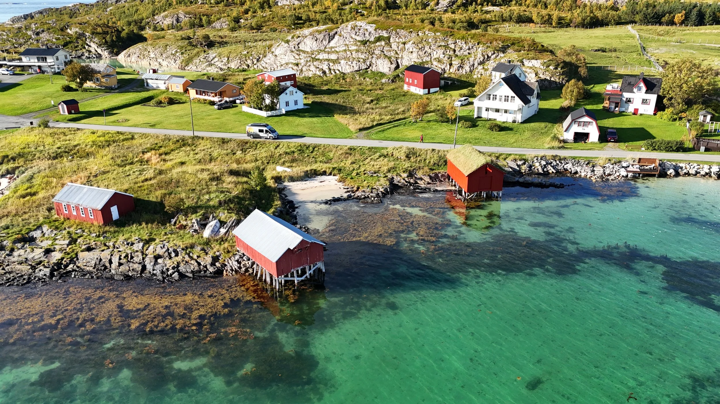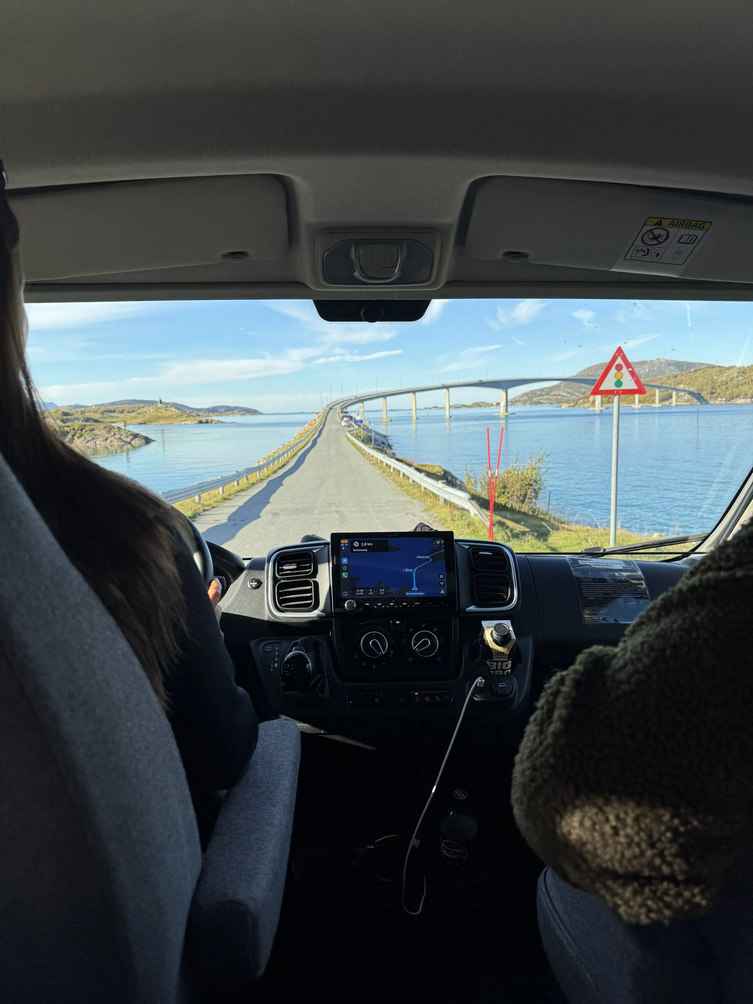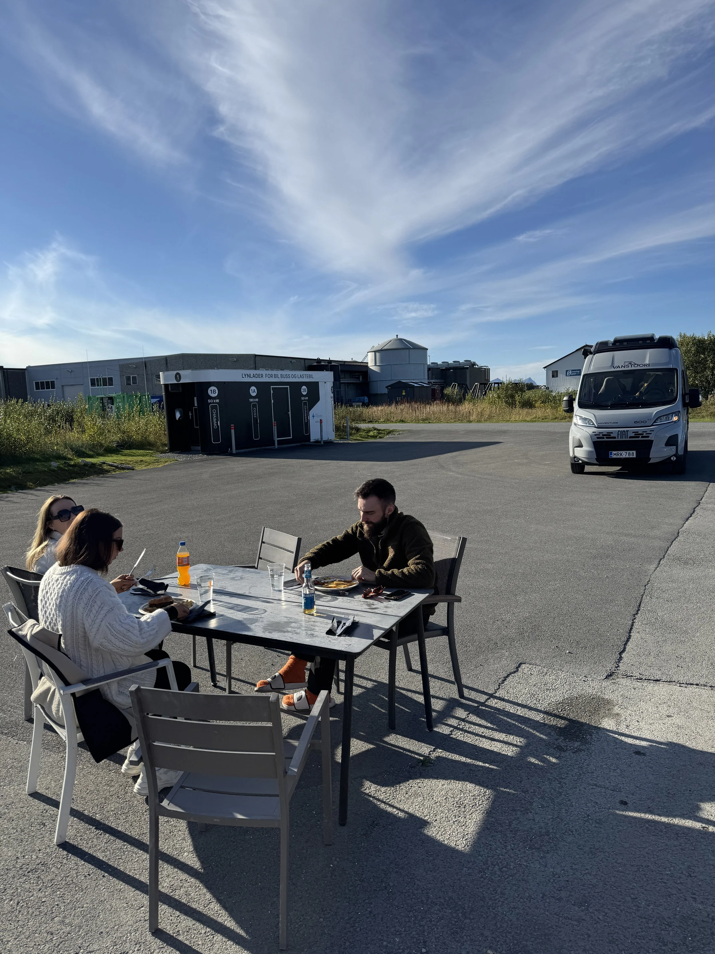 Aamulla pakkasimme auton ja jatkoimme matkaa kohti Tromssaa. Aurinko paistoi pilvettömältä taivaalta ja meri oli tyyni – sää oli täydellinen. Otimme lautan Senjan saarelta Kvaløyan saarelle (220 NOK). Matkalla pysähdyimme nopeasti Sommarøyan saarella, joka osoittautui todella kuvaukselliseksi. Saaren päässä olisi ollut myös helppo vaellusreitti, mutta koska Jessikan jalka oli edelleen huonossa kunnossa, tyydyimme ajamaan saaren ympäri autolla ja pysähdyimme syömään. Kävin itse rannalla keräämässä simpukoita Jessikan odottaessa autossa.